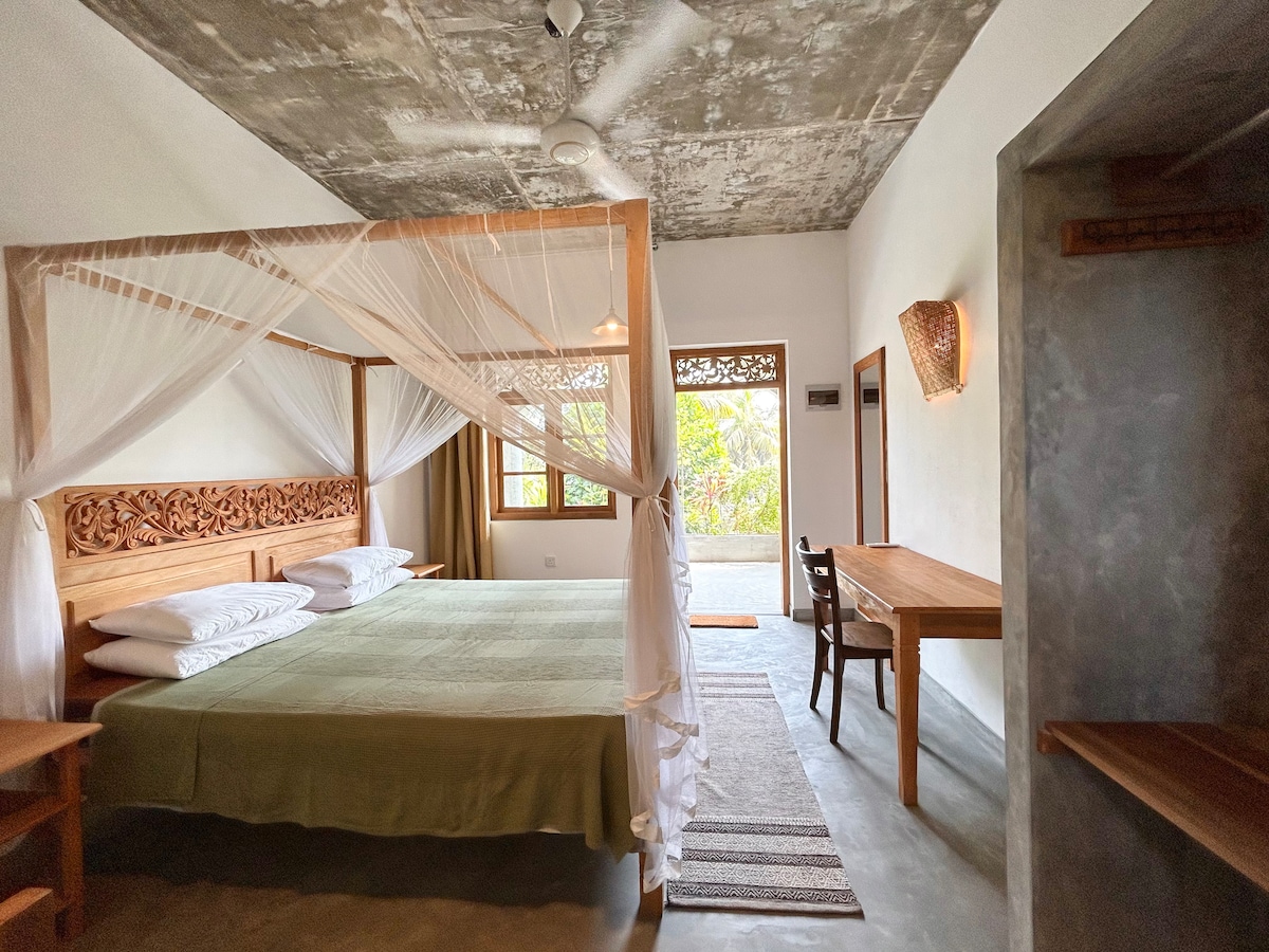 Lush green villa oasis situated in the buzzing little surf village of Midigama. Laid-back but with loads of TLC. Fully staffed with chef service and daily housekeeping. A villa has two interconnected ensuite bedrooms, flexible bed set up & an open sea view terrace. *An additional bed can be added to each bedroom-so can sleep 6* .Established tropical garden, pool & outdoor bathroom make this the perfect home base for couples, families or friends to spend quality time together in their own space.