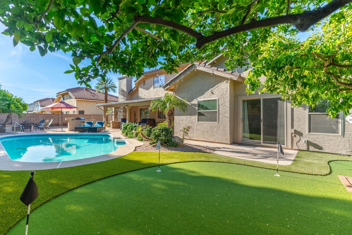 At Jake's Place, your family will be near all the best spots at this centrally-located home just 1 mile from the famed Heritage District of downtown Gilbert. Our backyard offers a Pool (not heated), hot tub, gazebo w/ propane fire pit, and BBQ. Inside you will find a Billiards room, a large 70" TV in the living room, and a well stocked kitchen. Come play at Jake’s Place. We provide a 55" and 50" TV in 2 of the 4 bedrooms. TPT# 21207708.