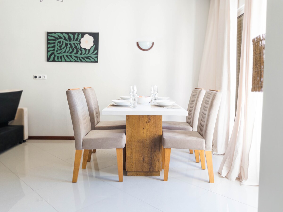 Enjoy a stylish experience at this centrally-located place. Close to the main square, Praça Nova and 3mn walk to Mindelo Bay. When entering the apartment, you will find a very bright living room with a balcony. The modern fully equipped kitchen has a stove, fridge-freezer, kettle, microwave and coffee machine. The master suite has a king bed size, private bathroom with comfortable walk-in showers, and a balcony. This apartment is perfect for four people.
