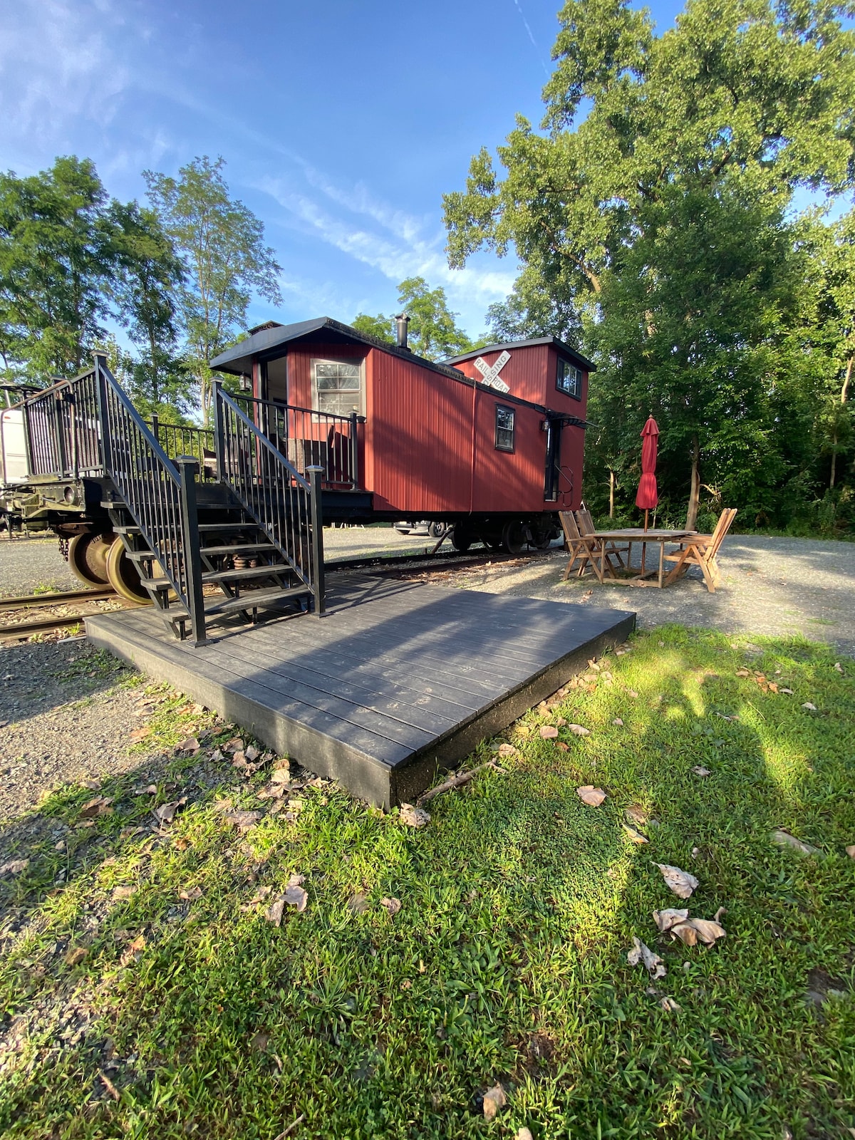 Located on our Mohawk Riverfront Property this beautifully renovated historic caboose was originally a D&H (Delaware Hudson) transfer caboose. Later sold to service the FJ&G Fonda, Johnstown & Gloversville area in upstate NY. Includes a full kitchen, full bath and loft area with a double bed. First floor has a queen pull out sofa bed. Smart TV and internet included as well as local channels. Well behaved pets allowed.