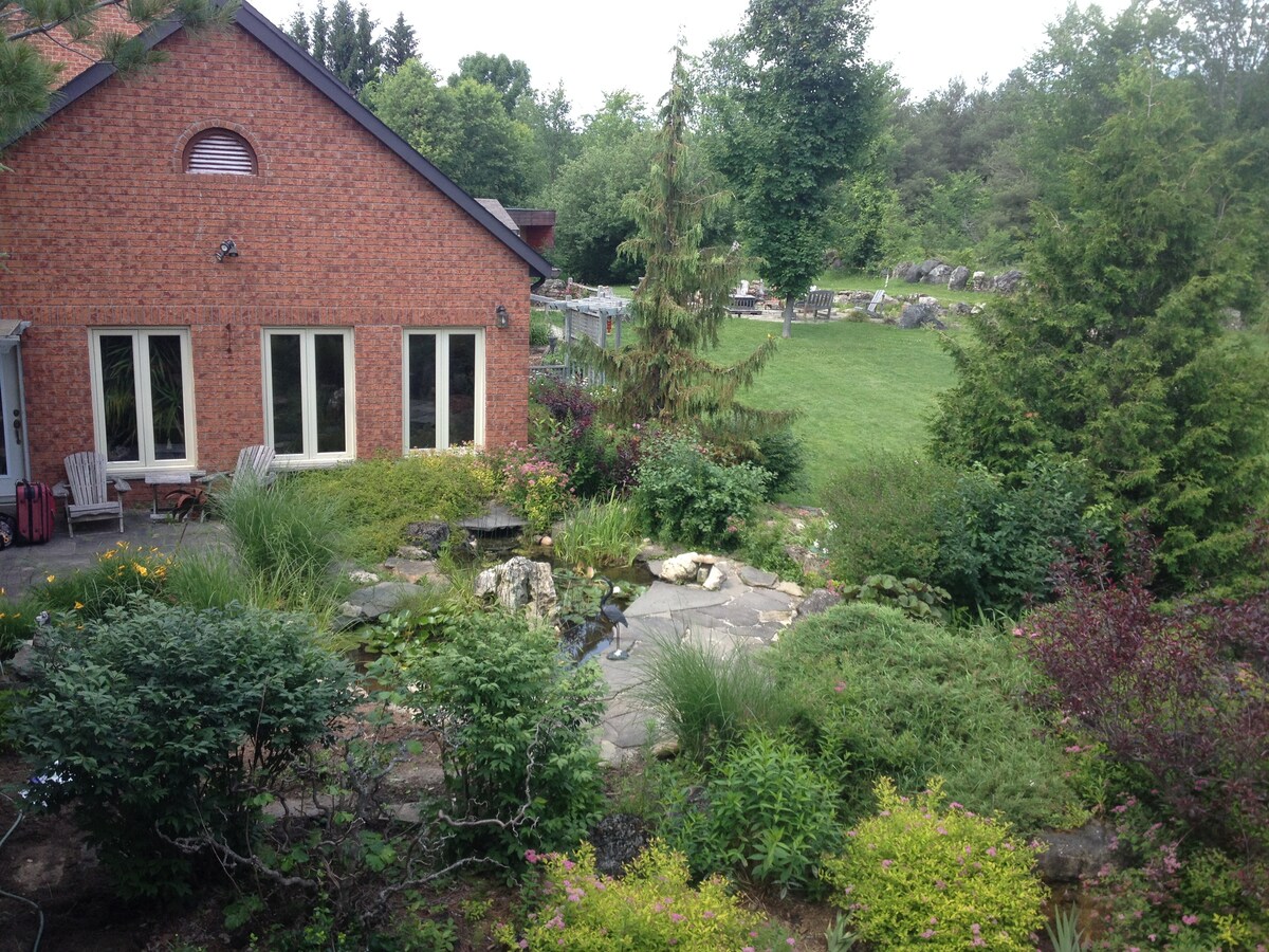 Peaceful secluded guest house in forest property 5 minutes from Orangeville. We have three active dogs who often demand attention! Can be arranged as a two bedroom with privacy or a one bedroom with extra room. King bed in the large bedroom. Double futon in the sitting room. Fabulous bathroom with views. The guest house is 70 feet from main house. Quiet, nice forest walks. NOT a 'corporate Airbnb' - managed by owner. Near Bruce Trail and Hockley.