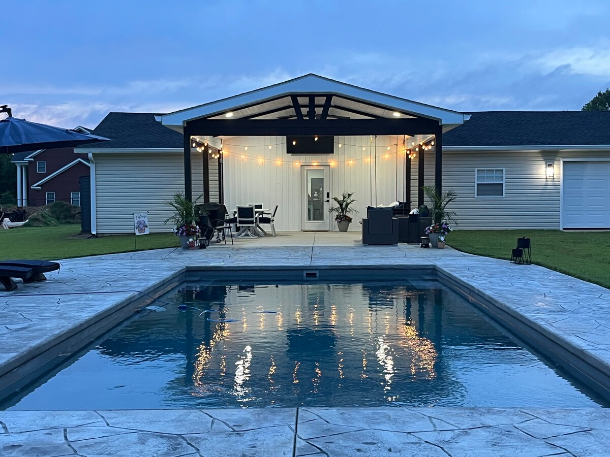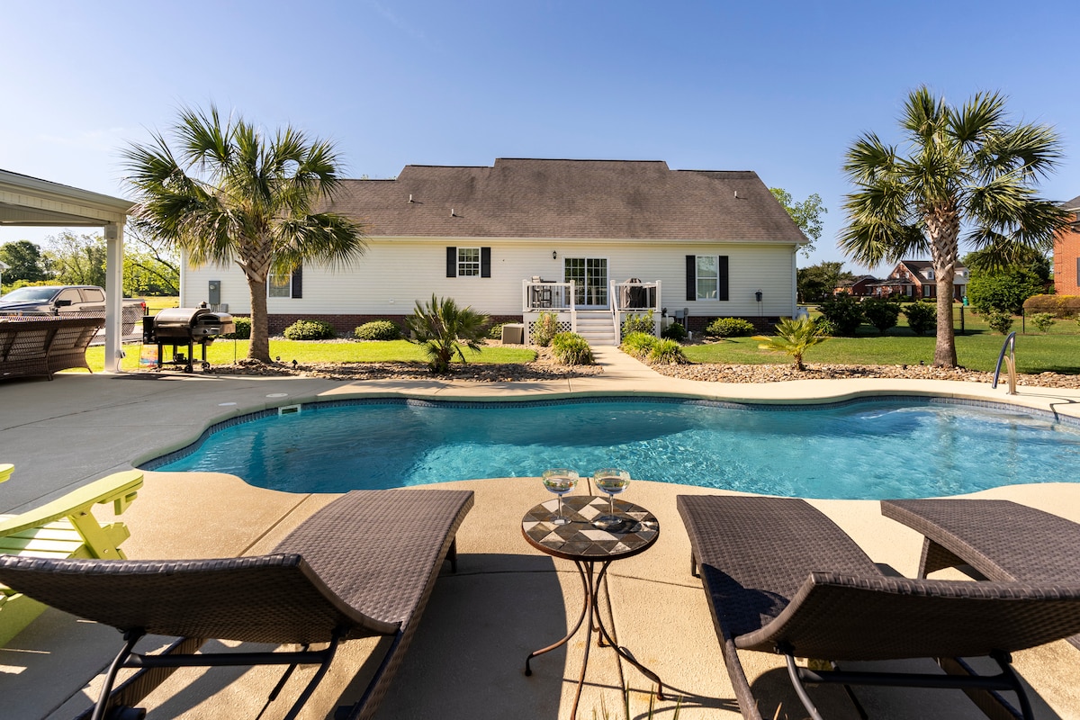 Newly remodel poolside escape. 1100 sq feet with 3 indoor TVs, 1 outdoor tv, and a foosball table. The house has a full bathroom, kitchen, and living area. It has a king bed, sleeper sofa, and couch (air mattresses available upon request) Stainless steal appliances and access to a 35 foot in ground pool with a splash pad and 6 foot deep end. Within 15 minutes of multiple wedding venues. Within an hour drive to Myrtle Beach. 30 minutes from I-95.