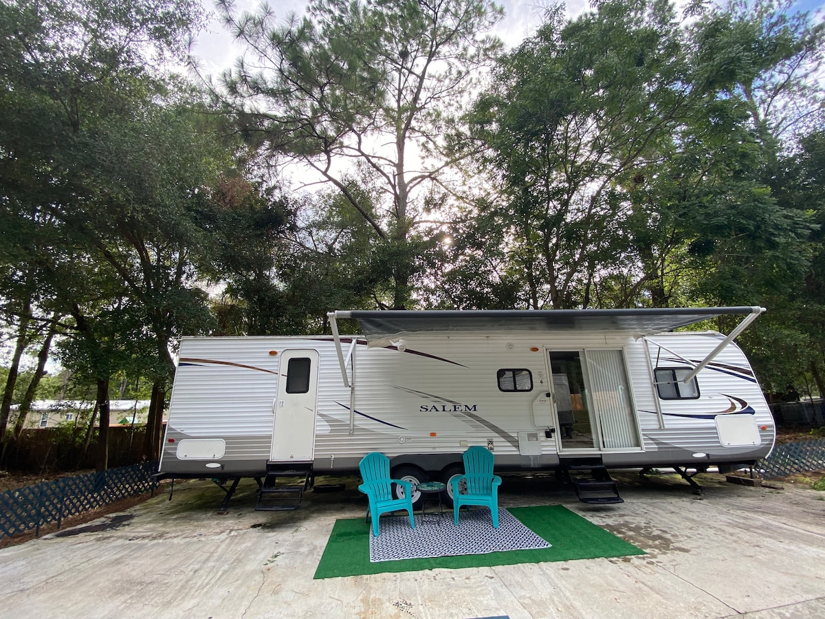 Get away from it all when you stay under the stars and Glamp the night away with family/friends. A one of a kind RVGlamp stay on shared Private Fenced property a short drive from Silver Spring State Park. A peaceful relaxing stay nestled away from the bustle but still very close to everything.If you love the outdoors and waking up to birds chirping this is the place for you. Watch an outdoor movie or roast some s’mores by the fire pit.Think camping but with all the comfortable indoor amenities