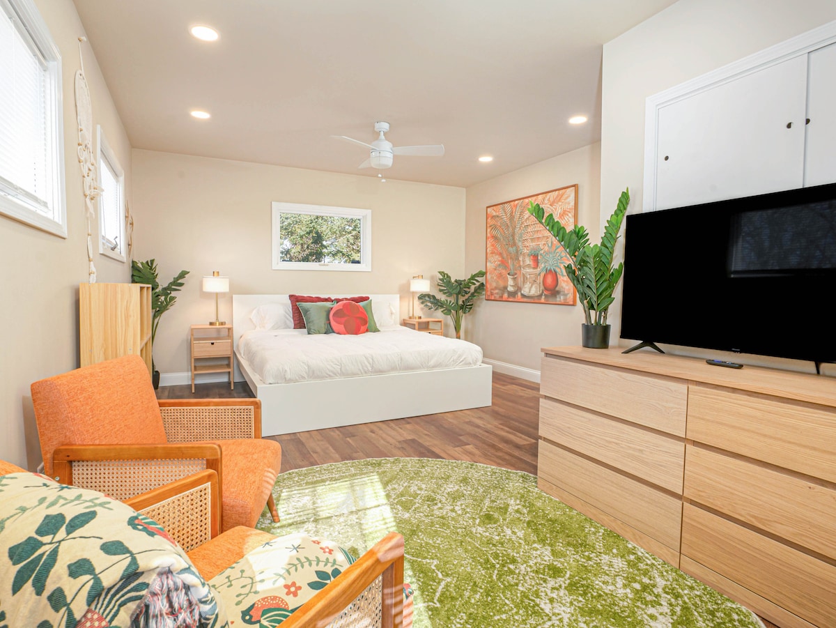 Welcome to @RidingHeights – our cute mid-century modern/bohemian style bungalow home. The décor is colorful, unique and functional. It is 900 square feet featuring an open concept, large kitchen and large bedroom with a king sized bed! The house is located a half block away from the Rock Island Trail, it is the longest trail in the area. The Heights Strip is only minutes away! Two street bikes are provided by us for your convenience. Message us about bringing a pet and we will consider them.