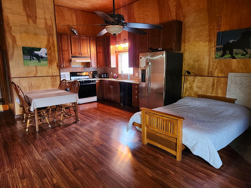 Exactly 9.6 miles from Peoria airport and exactly 14.6 miles to the Peoria Civic Center, this apartment is located in a quiet country area. This is an apartment in the Horsemeister stall barn. Private entrance, plenty of parking, This is a working horse farm with 2 stallions, mares and foals. Can sleep 4 adults comfortably but if you have a larger group you are welcome to bring airbeds. This is just 4 miles from the village of Hanna City. There is a sectional couch that can sleep 2 children.