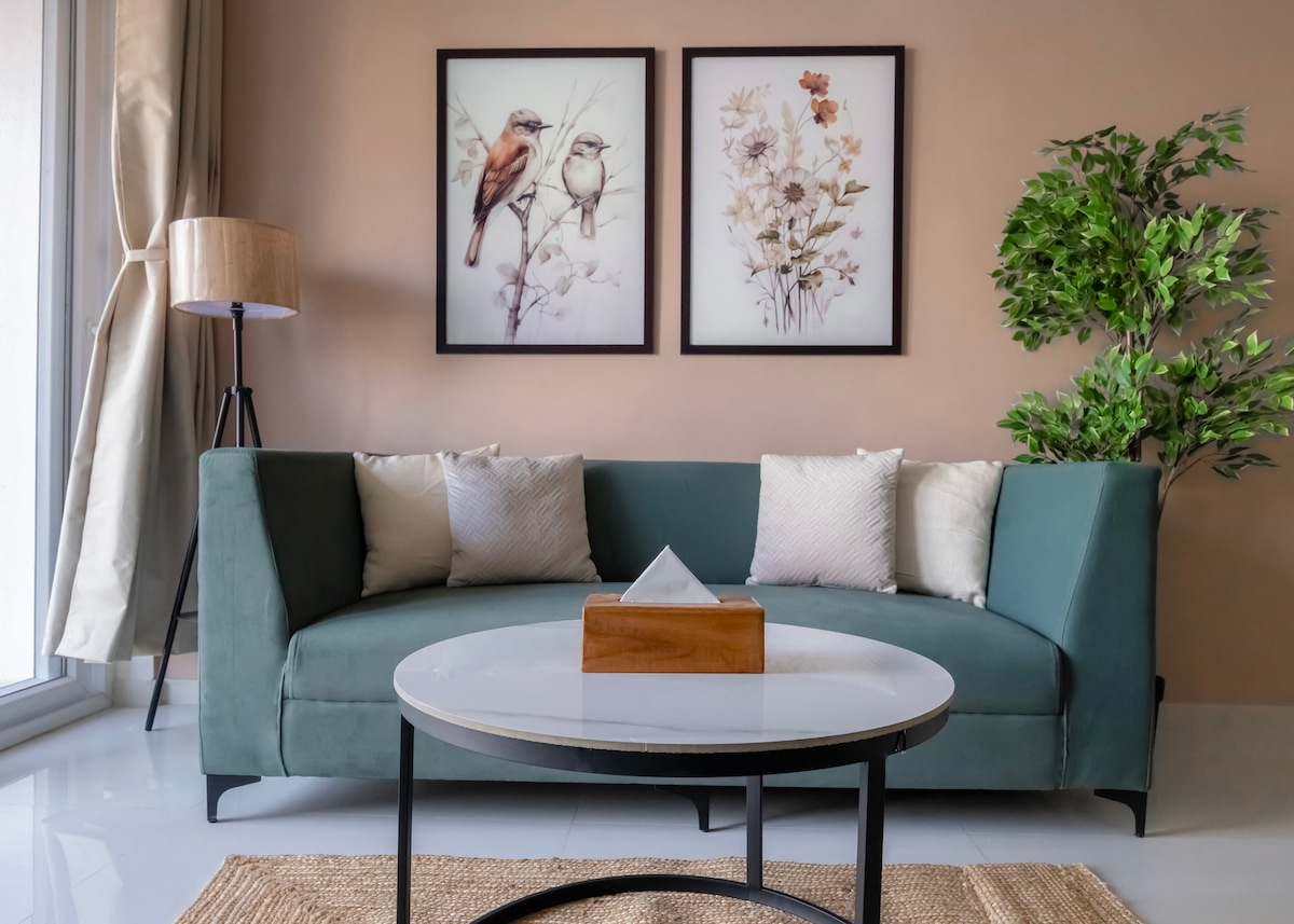 A place you will never forget for its beauty and scenic view. The flat is on the 19th Floor with the Golf view in front. Balcony in the hall and french windows in the bedroom is all you need to get mesmerized by the greenery you will witness. The flat itself is comfortable with a queen bed in the bedroom and a comfy couch in the living. Evenings, you have a choice of warm lighting or bright white lights.