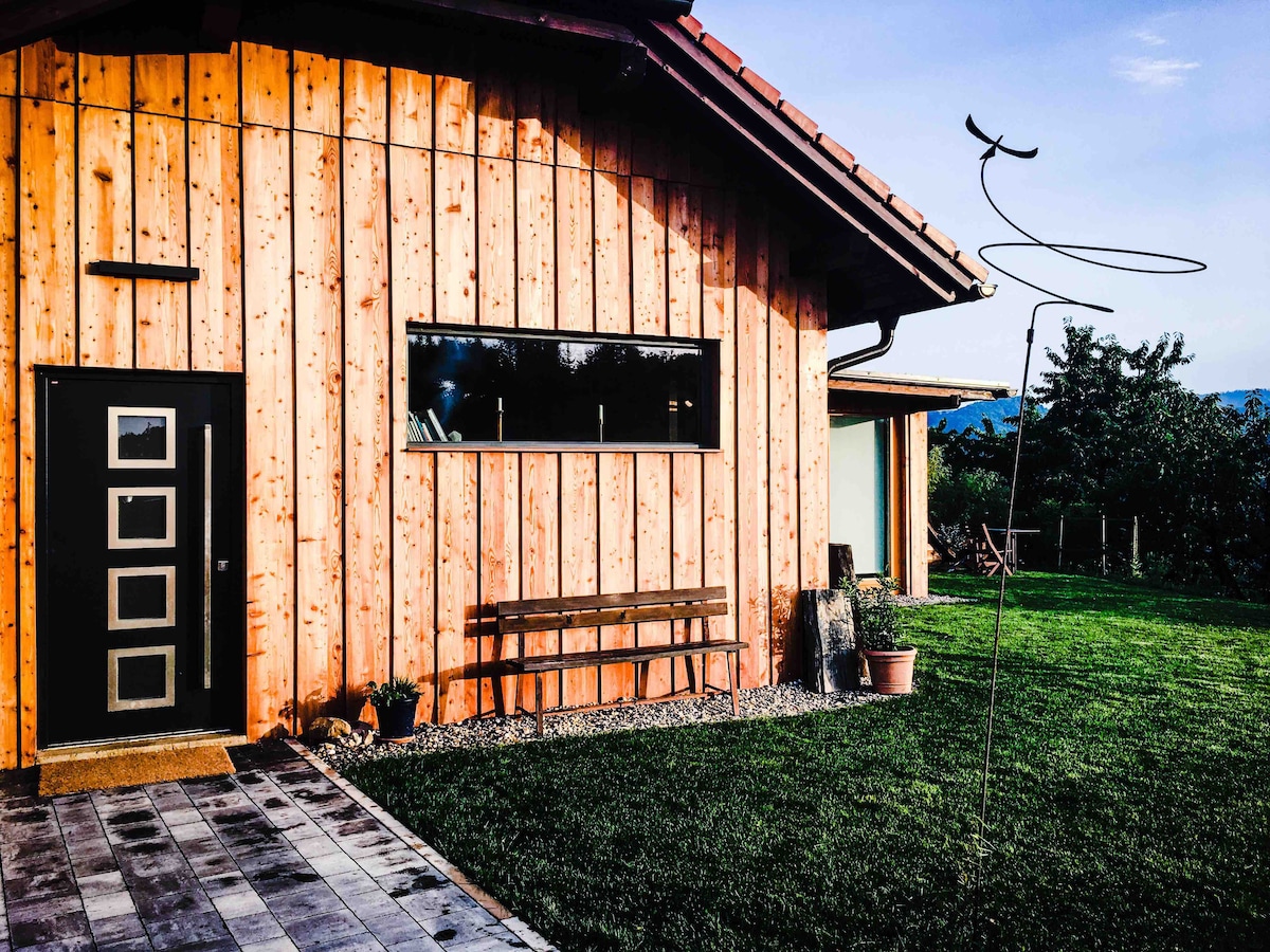 New brick house, wooden facade, inside clay plaster, wood. Large living room with kitchen, dining and lounge area (sofa) with fireplace. Wooden floors, chic bathroom. Spacious exercise room with generous views to the south and southwest. Outside: (wood-burning) sauna, bathtub with bath oven, cottage garden for picking berries, tea and herbs. Lots of space and lots of peace and quiet (hardly any light pollution) and just a stone's throw from the South Styrian Wine Route. This little oasis allows you to regenerate and relax.