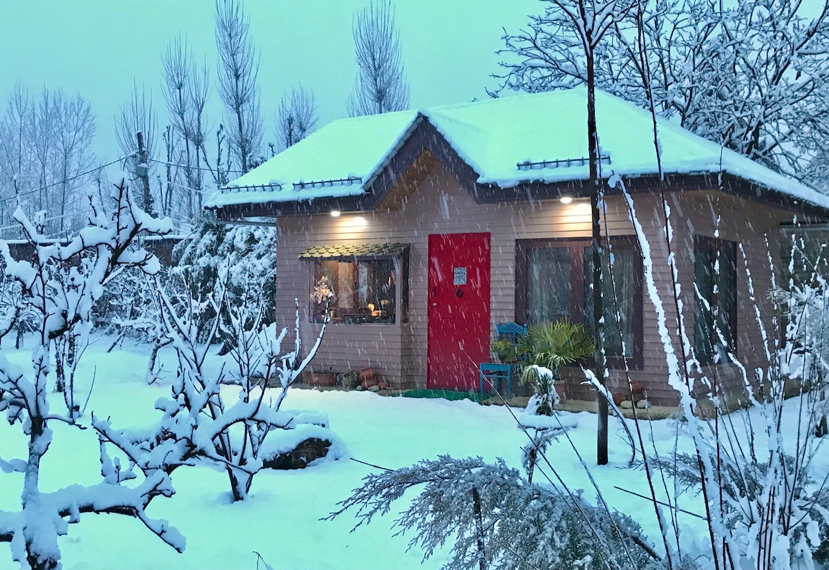 Unwind in this stunning cottage that offers urban comforts in the lap of nature. It has hot/cold AC, a cozy loft study, high speed WiFi, spacious kitchen & dining area. Outside there is a tastefully designed garden with fruit trees, pond, meditation gazebo, fire pit, pizza oven, organic produce & birds. You can commune with nature in this serene oasis that is walking distance from Dal Lake and close to Nishat & Shalimar gardens, Dachigam Forest & Hazratbal. Ask about our off-beat itineraries.