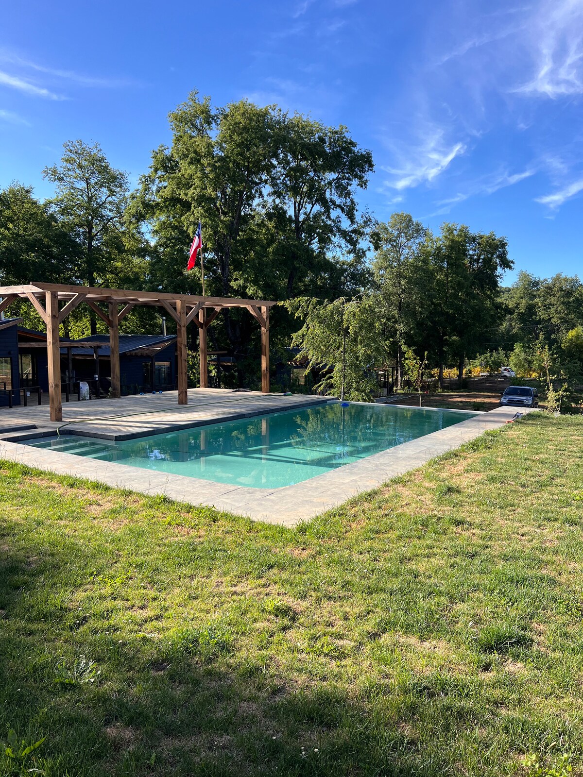 Disconnect from the routine and enjoy a weekend with your partner or family in this unique place surrounded by hualles, maitenes and hazelnut trees that mix with gardens and spaces for tranquility. For the summer season, an infinity-edge pool and a waterfall by volcanic rock, special for photos with effect. Strategically located between the Chillán River to the north and the Diguillín River to the south, both about 10 minutes away, in addition to supply areas (500m)