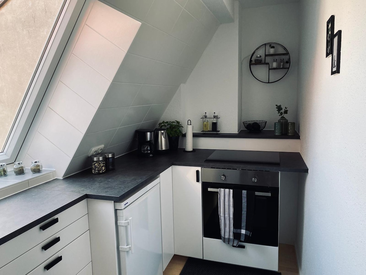 The apartment is located on the 4th floor of an old building from 1909 with views of the rooftops of Schweinfurt's old town. In this 40 m² attic apartment with a converted gable and unobstructed views, you will immediately feel at home. It has everything you need for a longer stay or for temporary living. It has a bathroom with shower and a brand new fully equipped, open kitchen with fridge, coffee maker, toaster, kettle, stove and dishes.