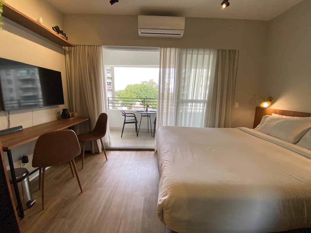 A 26m² studio with decoration signed by an architect in the heart of Jardins. Cozy atmosphere, ideal for people traveling alone, with friends, couples and families with children! We accommodate up to 4 guests with comfort and versatility We are located 3 minutes from the famous R. Oscar Freire: safe, full of restaurants, shops, pharmacies and markets In a central region, ideal for those who also want to explore important points of the city, such as Ibirapuera Park, Faria Lima Avenue, among others