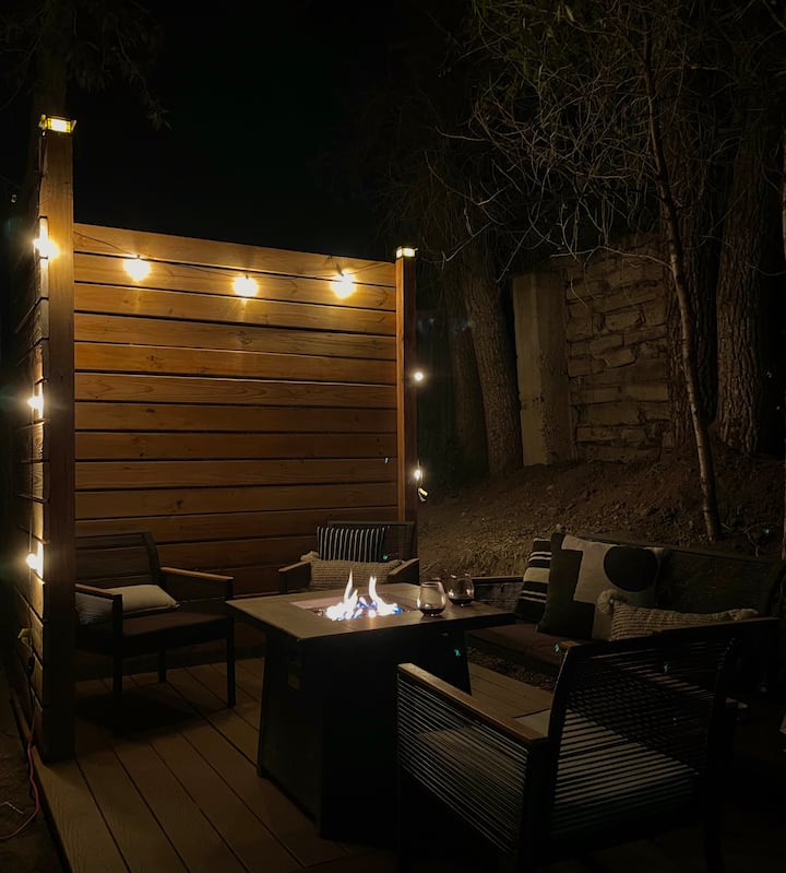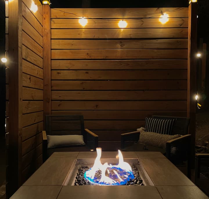 With the cabin being pretty compact on its own, we wanted the outdoor spaces to feel like a true extension of the home. In the front, we have a few chairs and a small table set up for you to enjoy the beautiful views and the sounds of the river across the street with your morning coffee! There is also a ceiling fan/light on the porch and a powerful ceiling-mounted heater for colder nights - both are controlled by remotes. The back yard is fully enclosed and features a deck with a seating area and slatted privacy wall for added privacy from the neighboring property, a hammock, propane grill, and movie projector. With the property being in town, we just ask that our guests be mindful of noise levels and are courteous of neighboring homes and businesses when using the projector late at night. Guests can enjoy a movie night under the stars or gather for a cookout with the game on the big screen! Make sure to check out the herb garden as well over the summer and feel free to take whatever you need to add a fresh twist to dinner!
