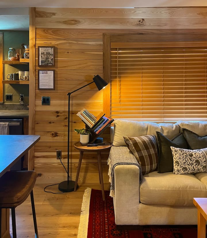 The main bedroom is toward the back of the house, right next to the bathroom. This bedroom features a cozy queen size bed, a beautiful custom made walnut dresser and full size closet, so you can unpack and make the space your own during your stay, a 43" Roku 4K TV, and lots of dimmable lighting options!