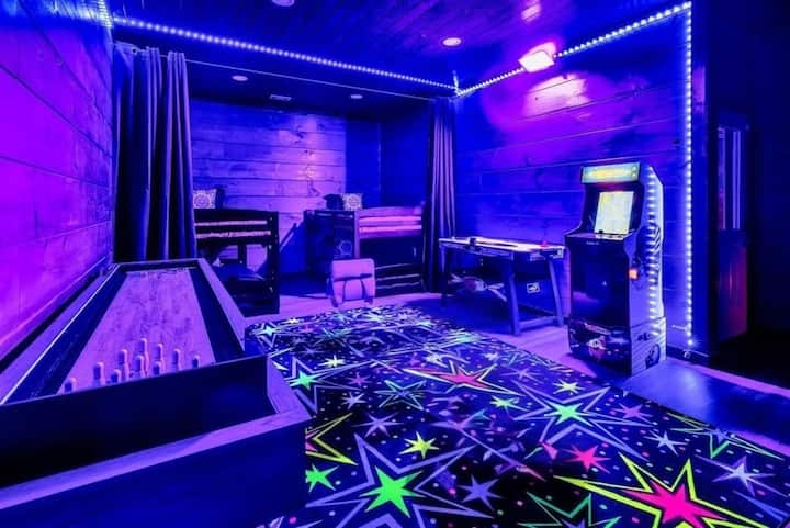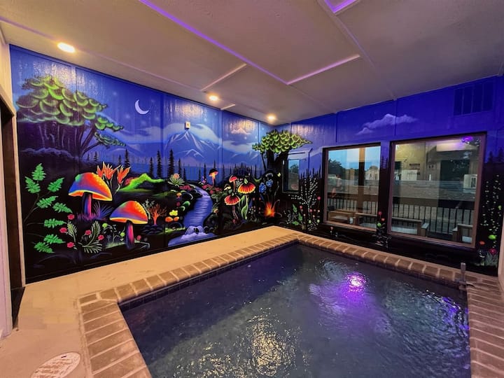 Discover Lumina Lodge, a luxury family-friendly retreat minutes from Dollywood, The Island and Gatlinburg favorites. Enjoy a exclusively hand painted glow-in-the-dark heated indoor pool, relaxing hot tub, glow-in-the-dark game room and a charming kids’ glamping nook. With stylish boho interiors, pet-friendly comfort and top amenities, Lumina Lodge delivers the ideal setting for unforgettable staycation.