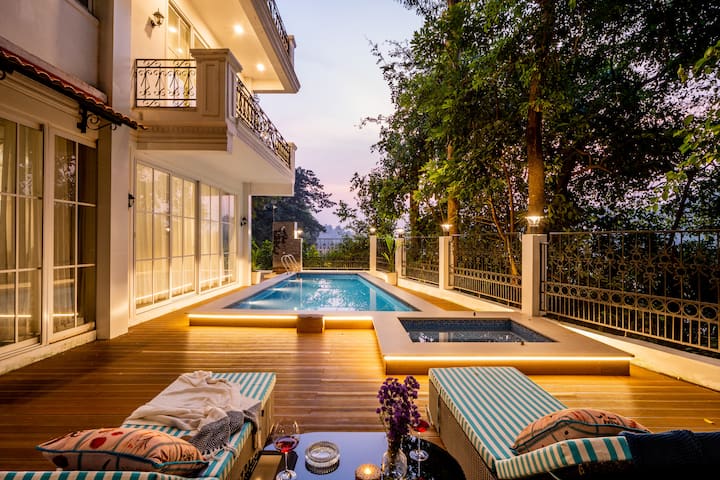 Escape to this luxurious 4-bedroom villa in serene Assagao, North Goa. Surrounded by lush greenery, the villa boasts elegant interiors, a vibrant turquoise kitchen, and ensuite bedrooms reflecting coastal charm. Relax by the pool with a crafted wooden deck, Jacuzzi, and charming gazebo. The Ivy Grand Hall offers modern elegance with Moroccan flooring and a warm ambiance. Close to Goa’s beaches and dining hotspots, this villa is your perfect retreat for relaxation and indulgence.