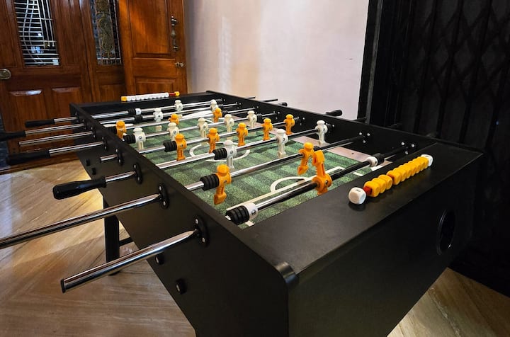 ✔ This is where I've set up the foosball table, and carrom table along with comfy couches and a 55 inch TV. Endless entertainment.