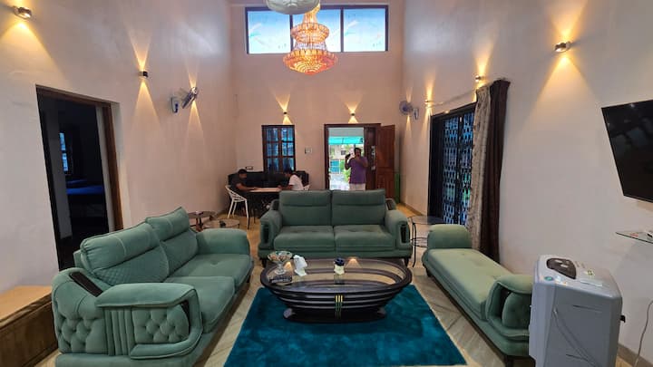 Villa has 5 bedrooms with double beds, living room arrangements, and additional mattresses