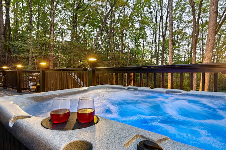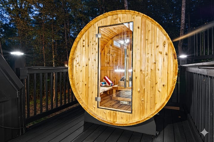 The outdoor spaces invite both adventure and relaxation. Ease into the bubbling hot tub or unwind in the barrel sauna after a day of exploring Blue Ridge. As the evening sets in, gather around the fire pit for stories and stargazing, surrounded by the gentle sounds of the woods. The driveway doubles as a pickleball and basketball court, adding a playful touch for guests who love a little friendly competition.