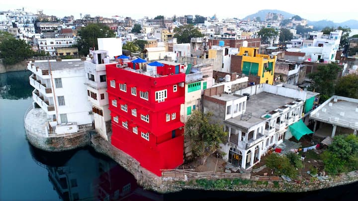 • oolala is YOUR lake house in Udaipur, Rajasthan: Two sides of this red house face the lake; it’s right on the edge of the lake, touching the water. You can’t get any closer than that. Every room in our house has lake-facing views (except the office and two of the bathrooms). From the rooftop terrace, you have 360-views of the lake and Udaipur + the wildlife living on a small island nearby (ducks, eagles, parrots, and many other types of birds). Coupled with that, oolala is in a vibrant neighborhood right in the center of Udaipur within walking distance of the most popular tourist attractions.