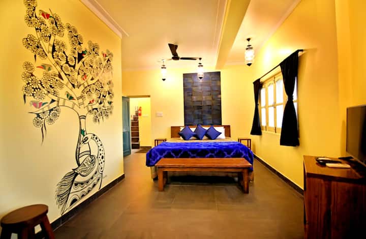 Two sides of our house—oolala—face the beautiful Lake Swaroop/Rang Sagar. Your private bedroom—the Blue Room—has lake-view windows, from which you can see a tiny island full of Rajasthani birds, feel the desert wind, and soak up the lakeside ambience, especially during wedding season. The feeling you get is the best Udaipur has to offer.