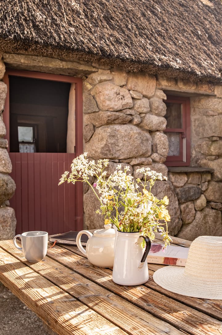 The Historical Thatch Cottage aka 'An Sceach Gheal' - is our centuries-old thatched roofed stone cottage named after the distinct c300 year old hawthorn tree that once grew at its gable end - has been lovingly and creatively restored and reimagined, with reclaimed timber, water reed (thatch), local stone and a renewable heating system.