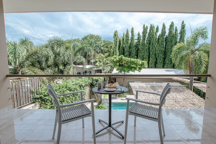 :::::::: Situated on the second floor: Our Studio Apartment comfortably accommodates 2 guests. Each studio with a large King bed, private bathroom, ample closet, and biodegradable amenities in Eco-Friendly dispensers. You'll also find a fully equipped kitchen, a dedicated work station, a balcony with a dining set for two while you enjoy a view of our custom designed pool and waterfall.