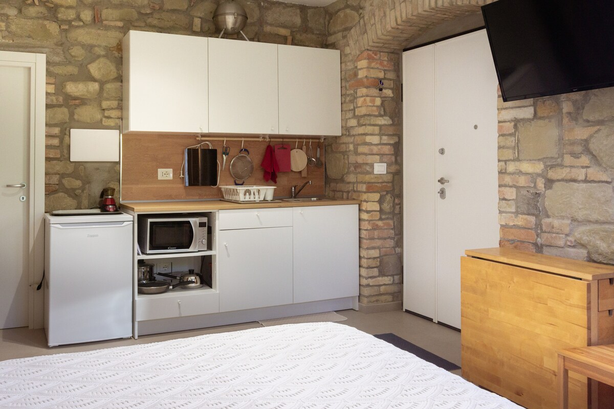 Newly renovated two-room apartment in the medieval village of Cossignano. The apartment consists of a double bedroom, living area with kitchen and sofa bed, bathroom and a balcony with a side table for two. In 5/10 minutes you go to the historic center, ideal for pleasant walks between panoramic views. In just 20 minutes by car you can reach San Benedetto del Tronto and Grottammare. A perfect corner for those who want to experience the Marche hills, without sacrificing the proximity of the sea.