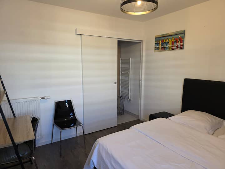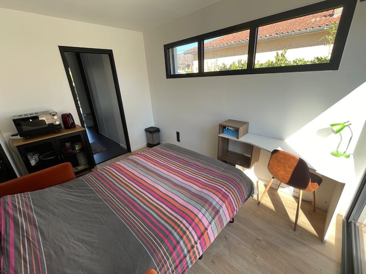 Bedroom with private bathroom, terrace, swimming pool, airport
