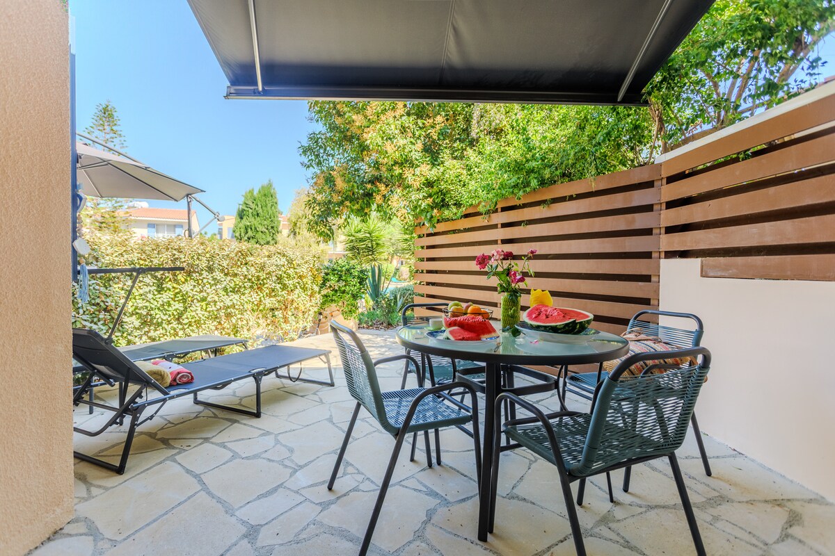 Relax and recharge Modern apartment as part of a well-kept, quiet apartment complex with pool and baby pool. Approximate distances: - (Stone) beach 1 km - Mandria 1.3 km - Airport 7 km - Paphos 15 km (15 min by bus) - 4 international golf courses 10 km - 24 km Home Ideal for 2 guests, sleeping possibilities for 4 people: 1 bedroom (double bed), 1 bathroom (bathtub), living room with sofa bed (for 2 people), dining area, fitted kitchen. Bedroom and living room with access to terrace & garden, access to pool.