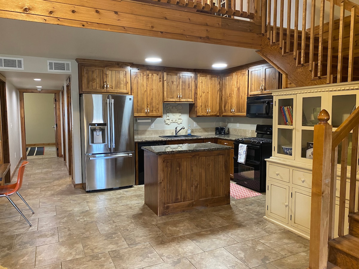The Bunk House has a bedroom with two queen beds and a closet. Kitchen with a microwave, stove, refrigerator and coffee pot. Connected table area. Open space with living room and screen tv in bedroom and living room with a DVD player availability. Bathroom with shower and towel available. Very clean built in 2015. We enjoy hosting.