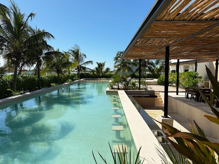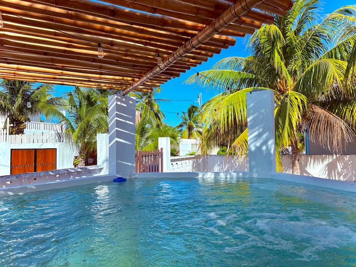 Suite #5, Terrace, kitchen. Beach house in Sisal.