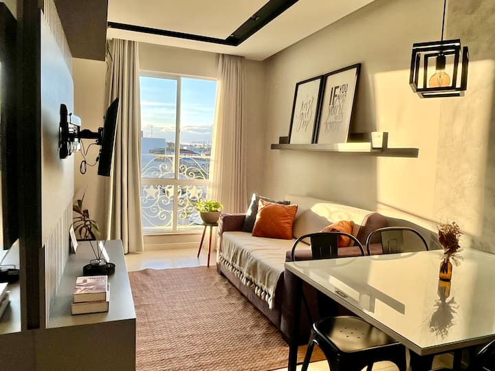Apartamento c/ lareira, rede e pôr do sol incrível