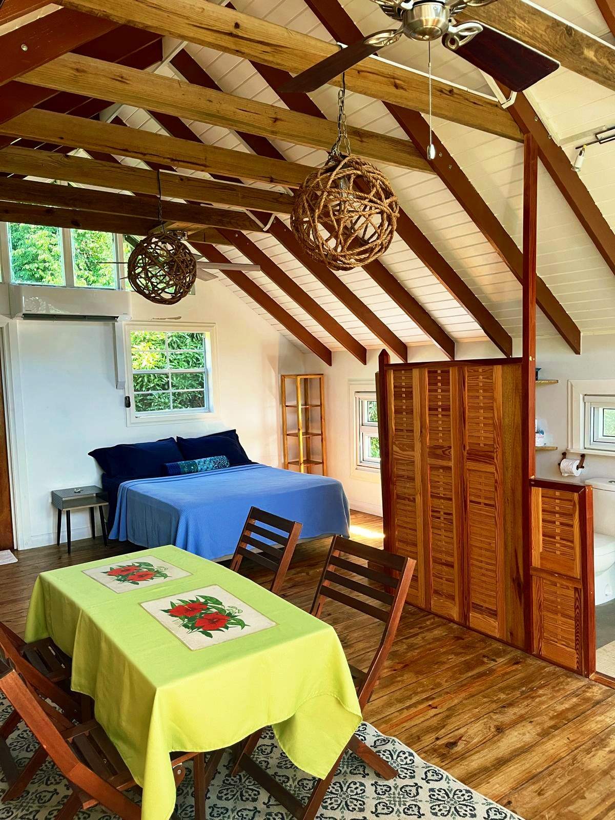Perched high on the hillside and surrounded by fruit and spice trees, this light and breezy loft invites you to slow down and reconnect. Natural light, cooling breezes, and sweeping views of green hills and the distant ocean create a serene, intimate escape. The loft features a soothing rain shower, a fully equipped kitchen, and thoughtfully designed comforts that blend simplicity with quiet luxury. Perfect for couples seeking peace, romance, and a retreat in harmony with nature.