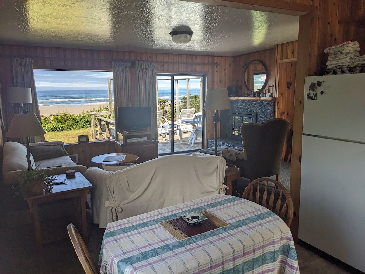 One level Oceanfront bungalow with spectacular views from the wall of double slider doors. Enjoy the ocean sights and sounds from this updated 2 bedroom, 1 bath home. Wood burning fireplace, washer and dryer and propane BBQ. Pets are welcome with a $50 fee and prior approval. We are a fully licensed rental and in compliance with local regulations. Nightly rate includes the 12% Lincoln County lodging tax. Airbnb collects the 2% state lodging tax