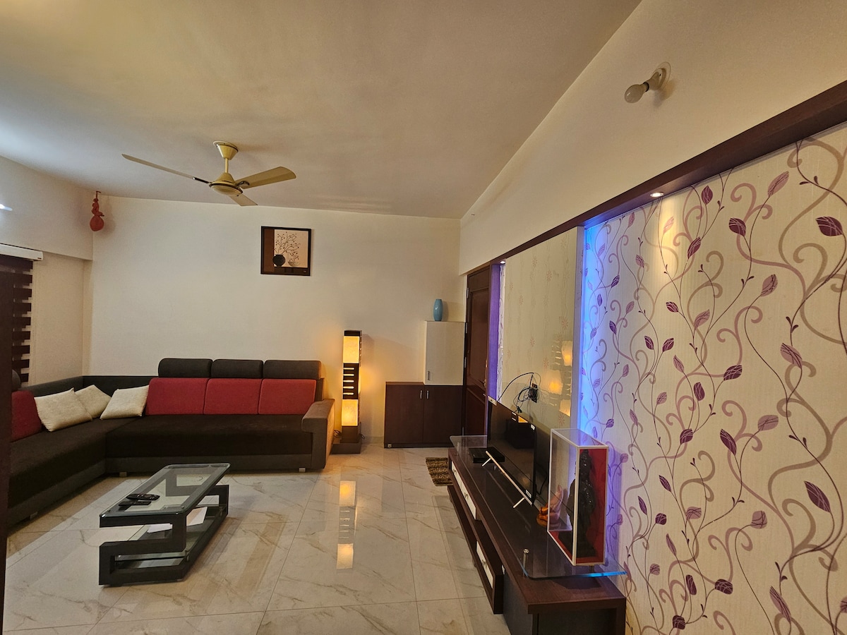 Welcome to your comfortable and fully furnished 1BHK, perfect for couples, solo travelers, working professionals, and small families. Your family will be close to everything when you stay at this centrally-located place. Entire 1BHK (private & secure) 1.Air-conditioned living room with sofa cum bed and TV 2. Bedroom with queen-size bed 2. High-Speed Wi-Fi - ideal for work from home 3. Fully functional Kitchen (basic utensils, kettle, gas, and Microwave oven.) 4. Clean bathroom 5. Balcony