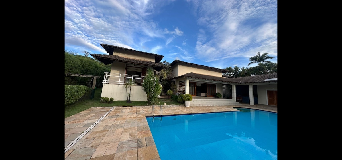 Villa on a private property immersed in nature and with unique architecture. Spacious, safe, with lakes, hiking trails and views! The property is super complete! It has a barbecue area, swimming pool, court, balcony in the rooms, fireplace, game room, card table, internet and etc. The house has a spectacular view of the valley, with hiking trails and a small waterfall. Perfect for relaxing over the weekend, holidays or even working from home. Ideal for families with children and the elderly and friends.