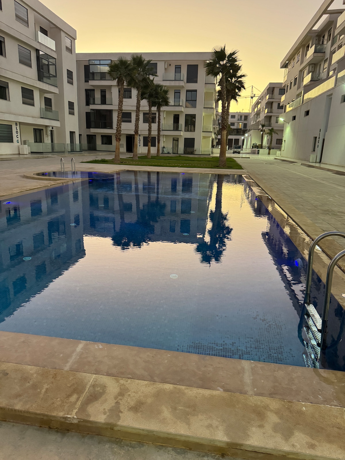 Modern and bright apartment in Agadir Bay, in a secure and closed residence with swimming pool. Splendid view of the pool, 2 balconies including one with swing. 15 min from the beach, 10 min from the city center, and next to restaurants, cafes and shops, hypermarket 2 min away. 2 bedrooms, fiber optics, air conditioning, equipped kitchen, fast Wi-Fi and free public parking for a comfortable and convenient stay