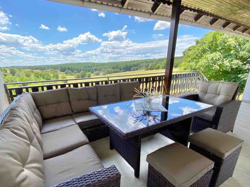 Modern bright and inviting, this home in Lopatinec “wine country” is perfect for your next family getaway or festive weekend. Two large terraces and lovely garden are great for entertaining, or for a great family weekend in the country. Designer touches abound throughout the property yet with all the comforts of home, including a 75-in. TV with surround sound, WiFi, outdoor pool, Jacuzzi for 5 and 4 parking spaces. Away from the city and crowds, yet close to grocery and town services.
