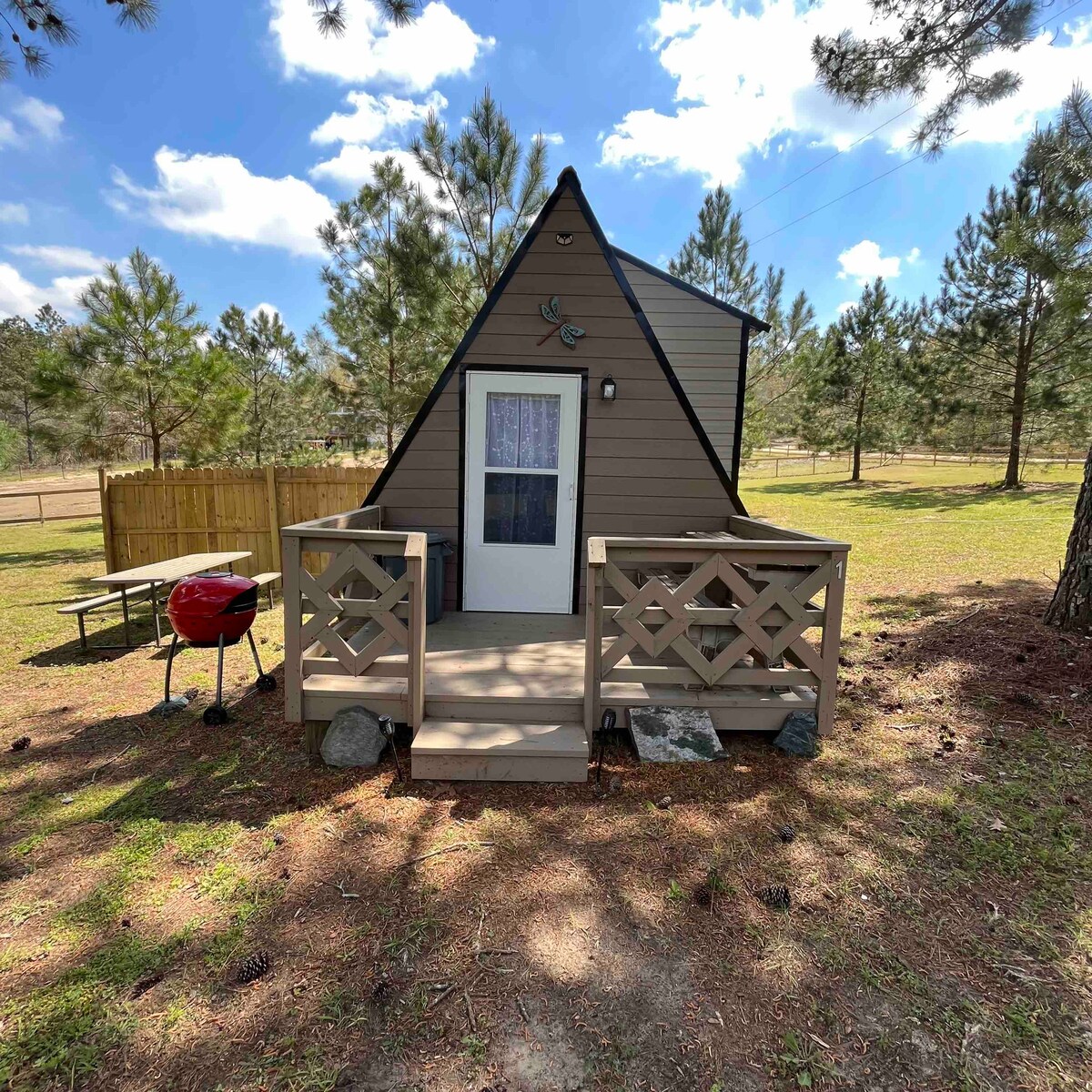 Kick back and relax in this adorable little cabin that is tucked up to one of our animal pastures. It comes fully furnished with a pullout queen sofa, bed with linens provided along with a full bathroom and shower. It has an efficiency kitchen with refrigerator freezer, microwave, single burner, Keurig coffee maker, or better yet, you can grill on your own private patio that is covered while watching the gorgeous sunsets.
