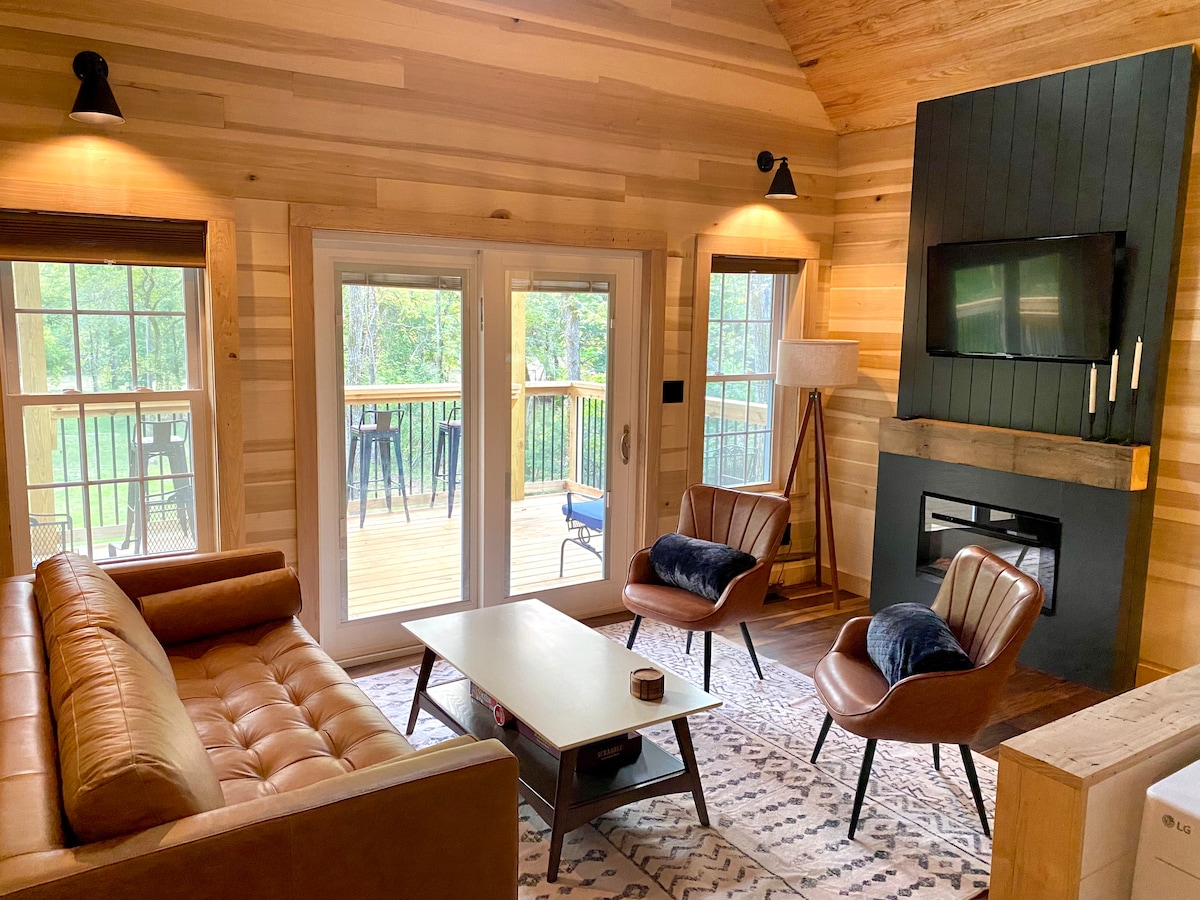 ★Beautiful setting only 30 mins from the Park ★Cabin built 2023 ★Hot tub and deck w/ lake view (no water access) ★Sleeps 4 (2 more children with sofa + foldable mattress ok) ★Outdoor area w/ views ★Fire pit ★Fireplace (electric) ★Walk to river & Shenandoah Outfitters-rafting, kayaking, boating, fishing ★Smart TVs ★Games ★Reliable WiFi ★Use your own streaming ★Dining area for 4 ★Stylish & upscale ★8 minutes to Bixler's Ferry Boat Launch ★20 mins - Luray ★30 mins - Shenandoah National Park