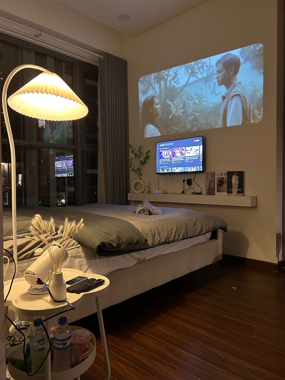 Căn phòng ngập tràn lãng mạn, tận hưởng netflix & chill Với thiết kế lấy tone trắng đen làm chủ đạo, decor thanh nhẹ với phong cách art châu Âu, cùng sắc đèn vàng ấm cúng, ban công hướng ra ngoài thành phố, máy chiếu có Netflix để chill buổi đêm, khu bếp nhỏ để tự nấu những món ăn thật ngon cho bản thân,...chắc chắn sẽ giúp bạn có những trải nghiệm chữa lành tâm hồn thật đặc biệt.