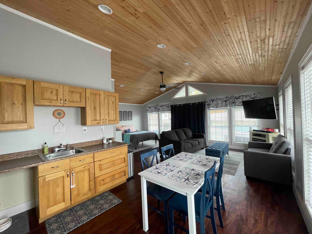 Experience a romantic, quiet, and cozy chalet designed for two! This charming retreat features vintage décor and all the modern amenities you need for a comfortable stay. Unwind indoors by kicking back and watching a movie, surfing the web, curling up with a good book or a friendly board game, or sharing a drink with that special someone. In the evening, relax on the cozy deck under the stars, basking in the warm glow of the gas fire pit or unwinding in the inviting private hot tub!