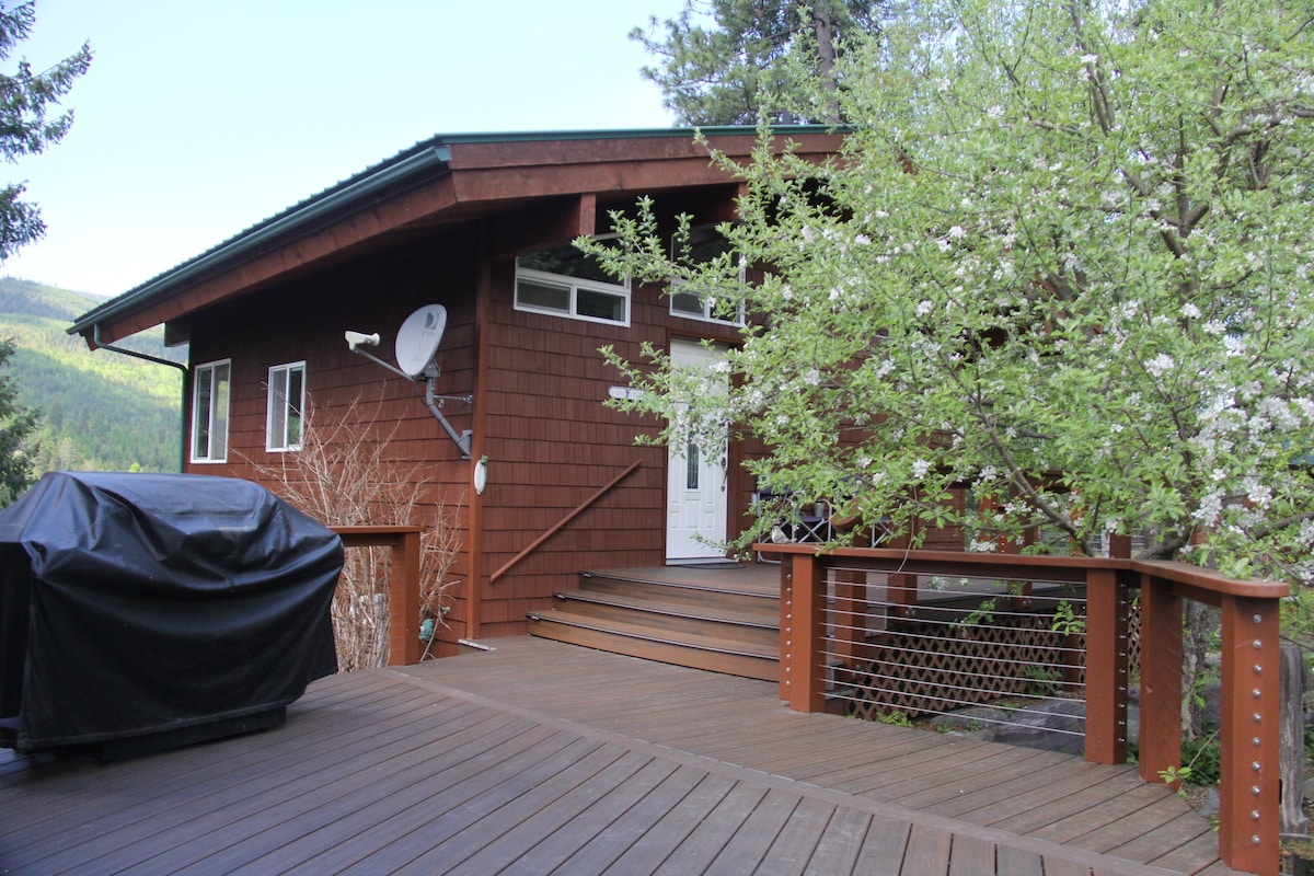 Looking for a quiet place to relax? Mountain & Valley view Charcoal Grill Picnic Table Fire Pit Secluded, not isolated Full kitchen & bath w/shower WiFi 3 beds upstairs: Queen, Full, Twin Parking: 2 vehicles 1 acre fenced +10 acres wooded on-property, or drive to national park service trailheads/local lakes. 5min to Bonners Ferry, 35min to Sandpoint Note: Please read entire listing before booking, including cancellation policy. WINTER GUESTS may need to shovel snow by gate; shovels provided.