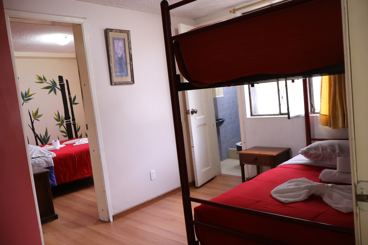 Quadruple room located in the center of Baños de Agua Santa very close to restaurants, shops, tour operators. The room features a double bed and 2 single beds with a private bathroom.