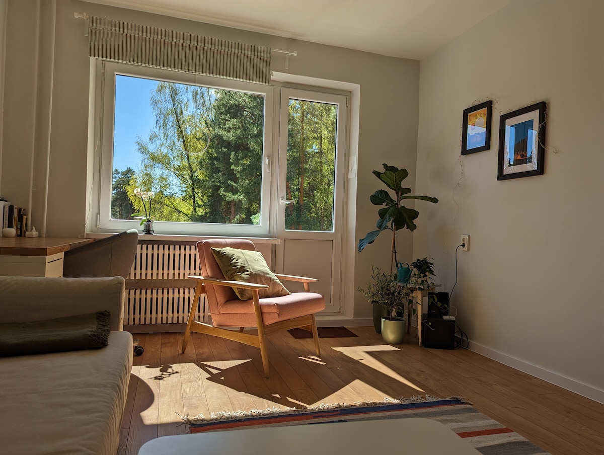 This cozy one-bedroom flat on the first floor is located in the city center and is perfect for 2-4 people. You can feel the countryside atmosphere here, surrounded by a park, with a forest and lake just across the road. The flat features a sunny balcony and is conveniently located near the main city square, shopping center, and grocery stores. It is an ideal place for both business trips and holidays. The apartment is equipped with Wi-Fi, a smart TV, and a washing machine.