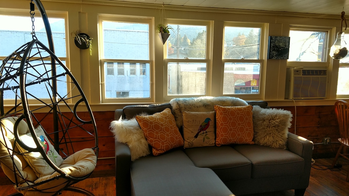 Riverside Avenue Retreat(a legal, licensed nightly rental with a current Okanogan County health permit as required by law) is located right in the heart of downtown Winthrop, and is close to the old western boardwalk, shops and eateries. It is a complete apartment suite where you can stay for awhile. There is a King bed, a gorgeous fireplace setting, Smart TV and a comfortable Queen size sofa sleeper, and so much more. Shared parking is available behind building.