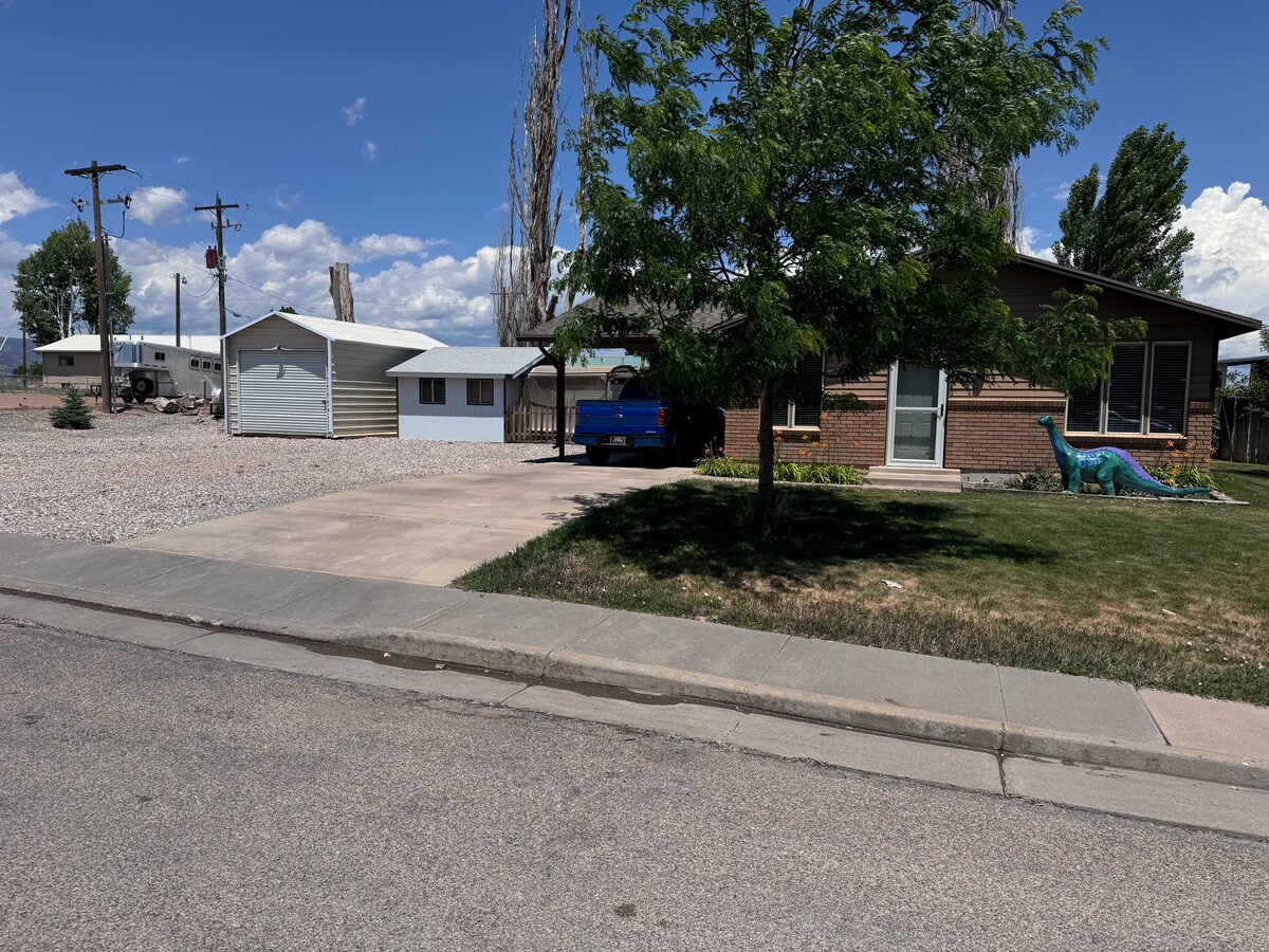 WE DON’T REQUIRE ANY CHORES! Come unwind at our 4 bedroom, 2 bath home. Sleeps 8 people comfortably. We offer a king suite with a master bath, 2 bedrooms with queen beds and 1 bedroom with twin beds. Minutes from downtown Vernal. Private drive with easy access for RV/ATV parking. 3.9 miles from the Dinosaur Museum. 24 minutes to Dinosaur National Quarry. 43 minutes to Flaming Gorge. Lots of great local mountain biking and ATV trails. Comfortable beds and fully stocked kitchen.