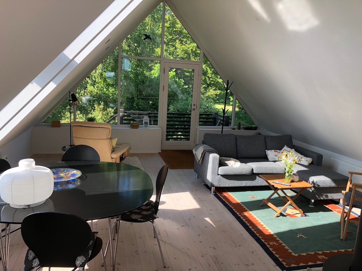 Take it easy at this unique and tranquil getaway. Here is space for a shorter or longer stay in the middle of nature. The apartment is kept in a beautiful Nordic style with a homely decor. The light and the green nature with fields and trees around create a special atmosphere that makes you want to just be.