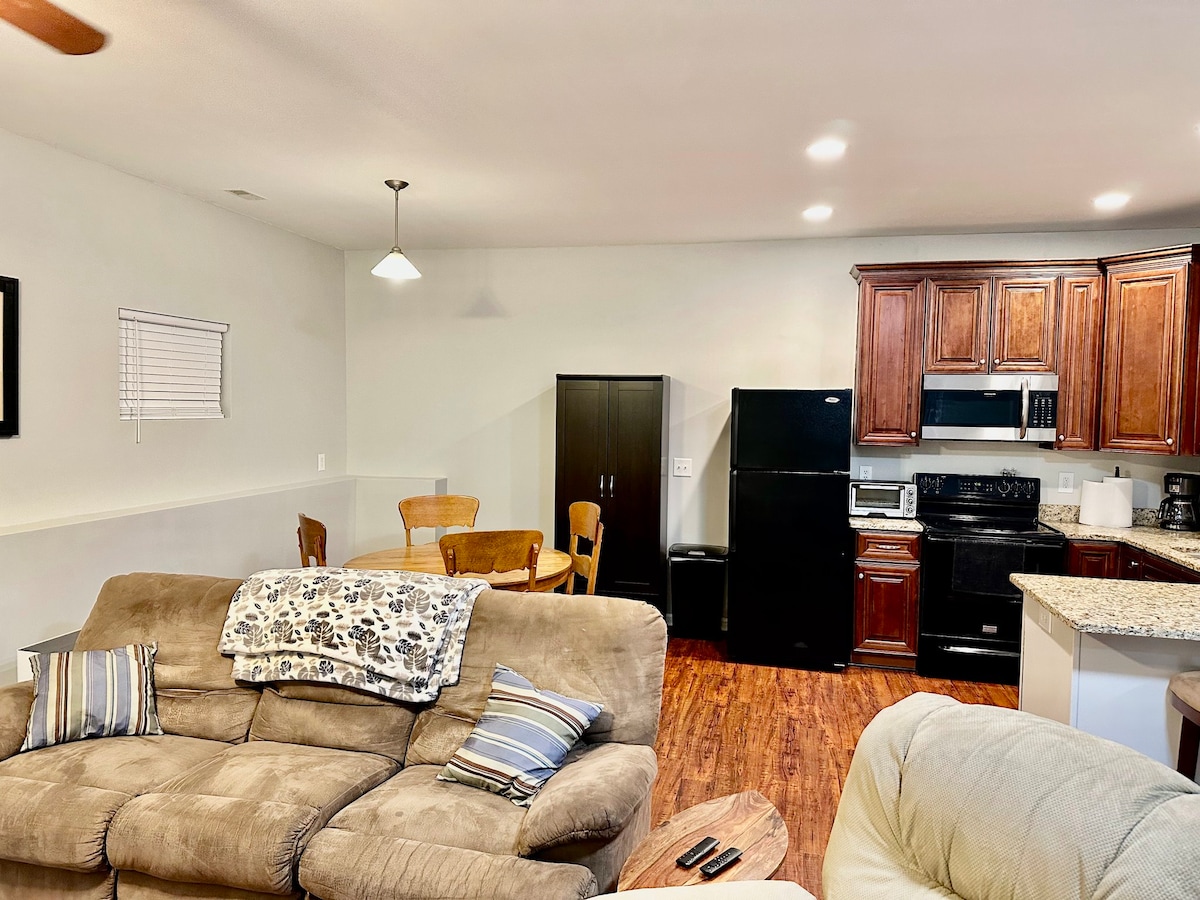 Indigo Terrace is a new one-bedroom basement apartment perfect for a couple, small family or business traveler. This modern space features a beautiful, spacious bathroom (with tub for 2!), full kitchen, one bedroom with queen bed, and sleeper sofa in living room. It’s located in a quiet, tree-lined neighborhood and has a private driveway & entrance with self check-in. Conveniently situated off a main road, it's close to GSP airport, Taylors Mill, and just 8 miles from downtown Greenville.