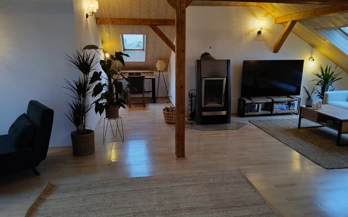The apartment is on the first floor and is nice and cool in summer. It has been completely renovated and lovingly designed by us with a lot of craftsmanship. The wood workshop is in the house. (only as a hobby....no noise is to be expected)😉 The garden is a small oasis and in it is my florist workshop, which I run commercially. The rooms of the apartment are bright, spacious and friendly. Blackout blinds are attached. The kitchen is well stocked with everything you could ever need. As host, I live on site and am always available to answer any questions you may have. Books and games are provided.